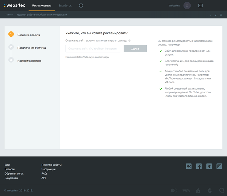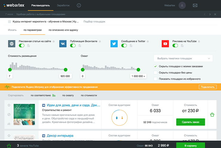 2. Выберите площадки для размещения рекламы